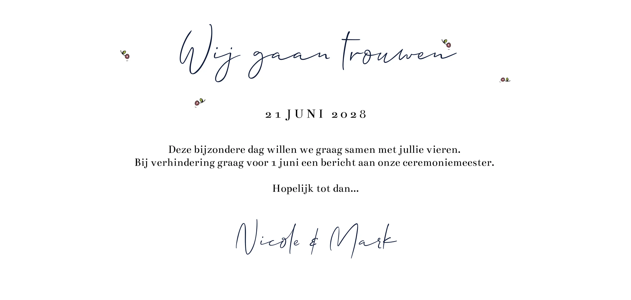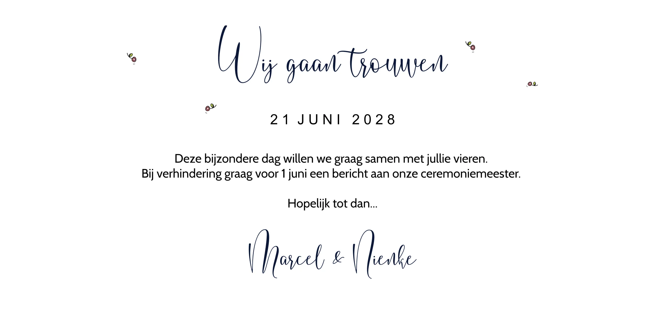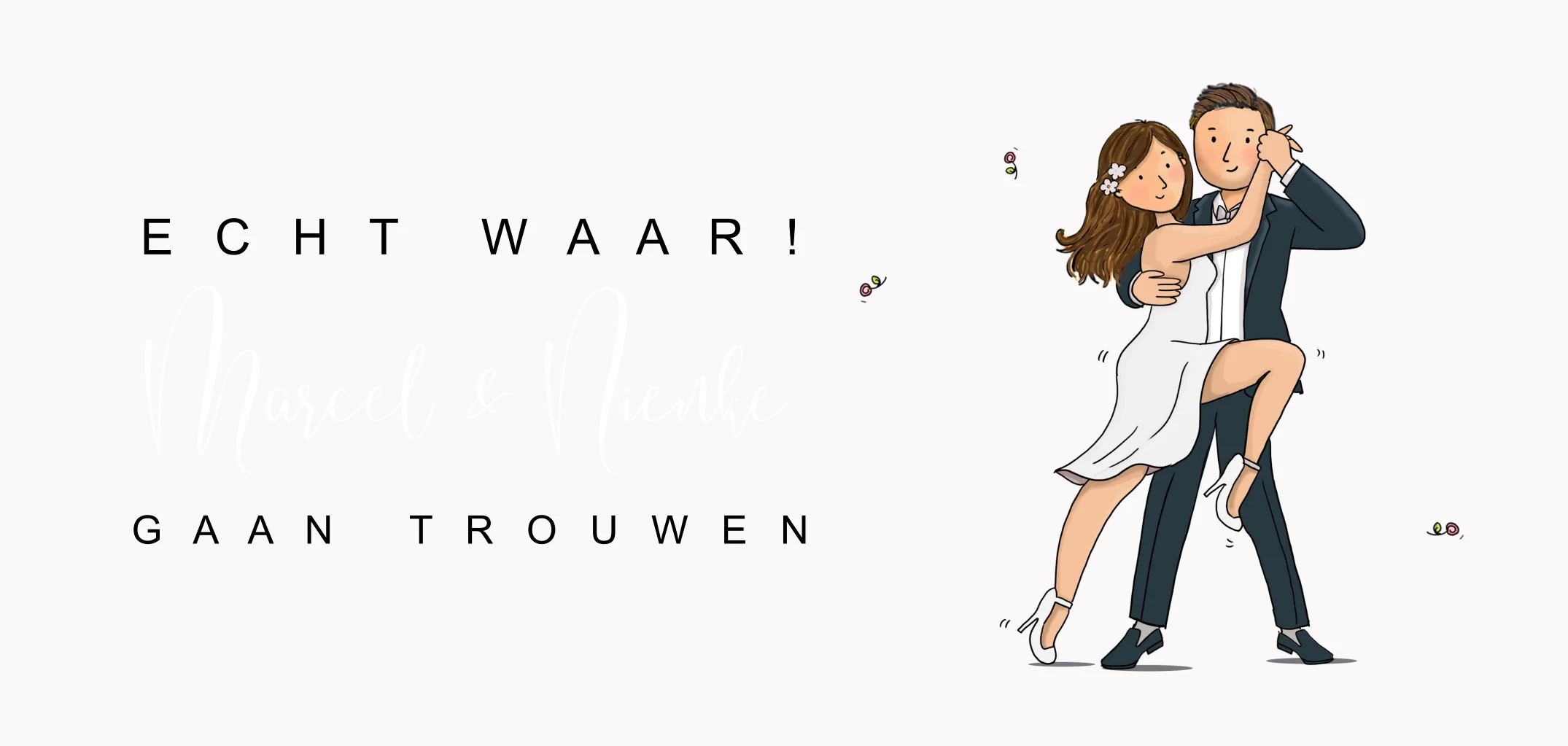 Grappige trouwkaart langwerpig met getekende bruidspaar dansend in bruidskleding met bloemetjes. (24057) Willen jullie de tekening aangepast hebben zodat het meer op jullie lijkt? Vaak is dat mogelijk, neem daarvoor contact met ons op.