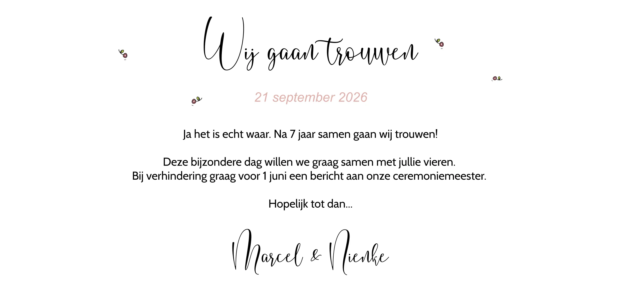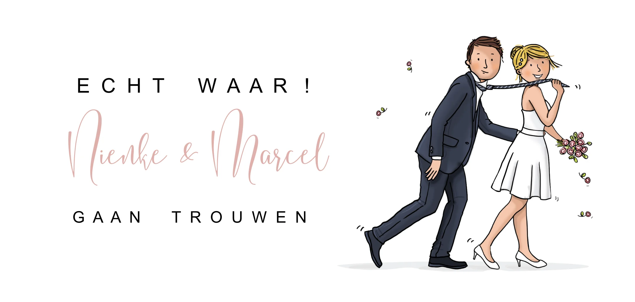 Grappige trouwkaart langwerpig met getekend bruidspaar. De bruid trekt de bruidegom mee aan zijn stropdas. (20750) Willen jullie de tekening aangepast hebben zodat het meer op jullie lijkt? Vaak is dat mogelijk, neem daarvoor contact met ons op.