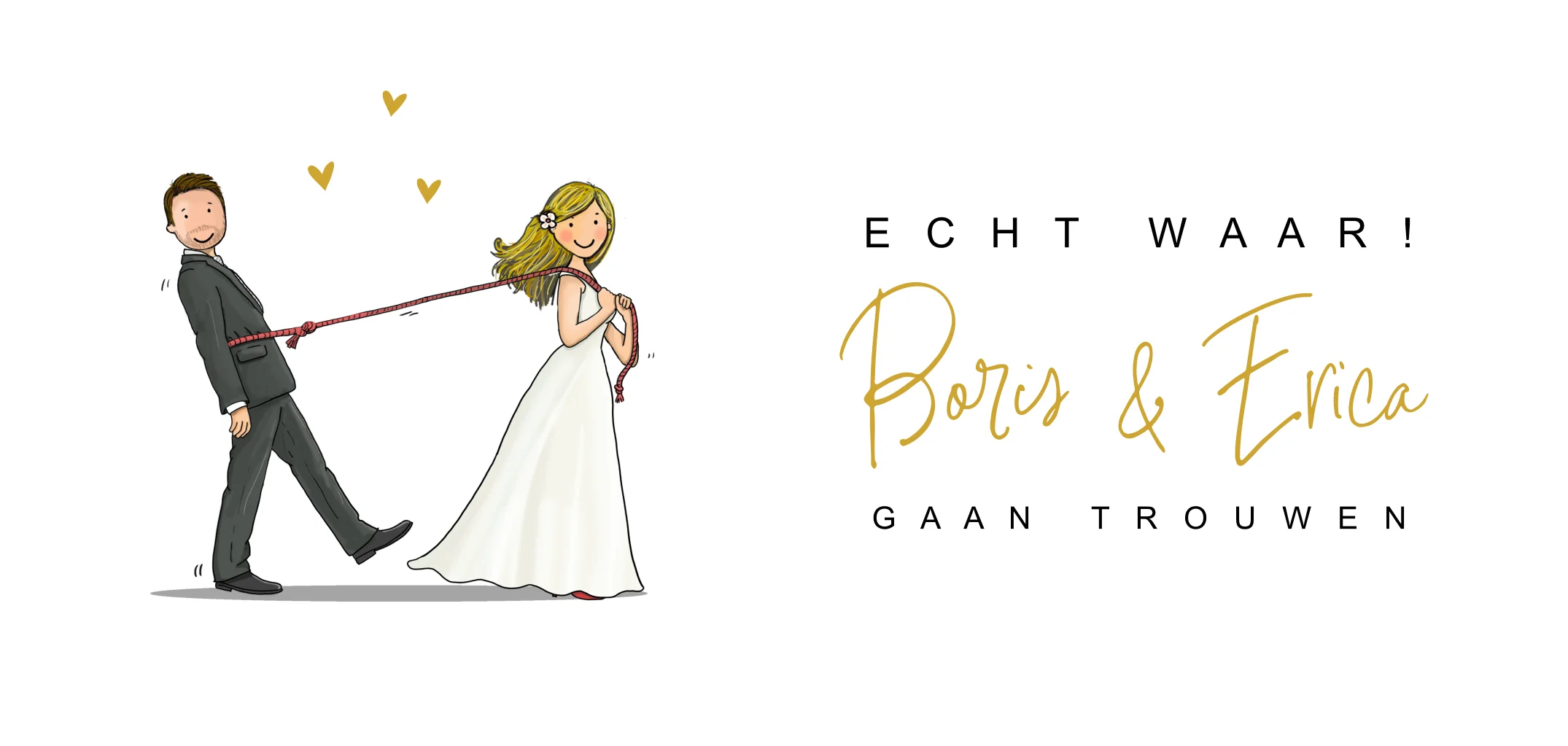Grappige trouwkaart langwerpig met bruidspaar touw. (22732) Willen jullie de tekening aangepast hebben zodat het meer op jullie lijkt? Vaak is dat mogelijk, neem daarvoor contact met ons op.