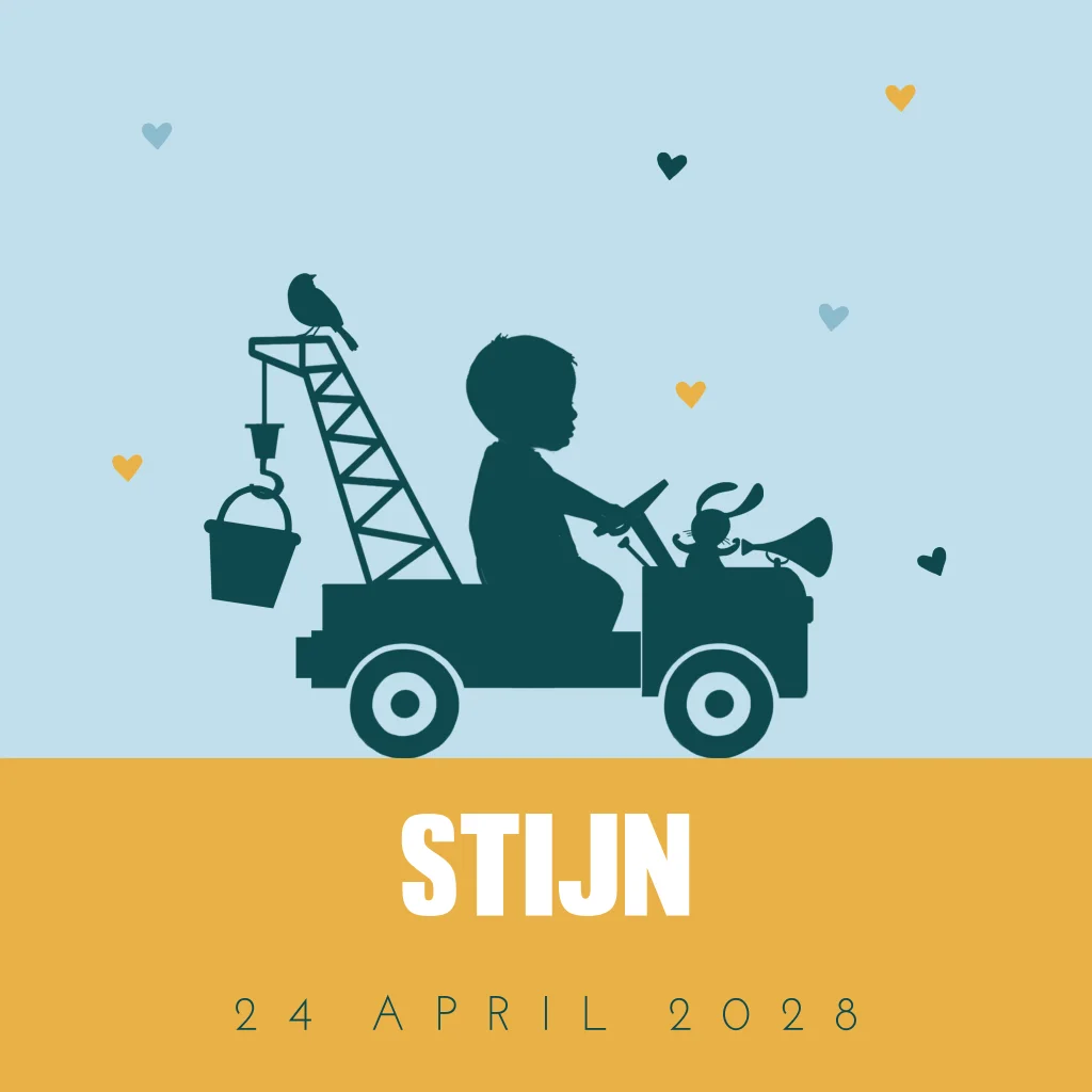 Auto geboortekaartje jongen met felle kleuren hijskraanwagen