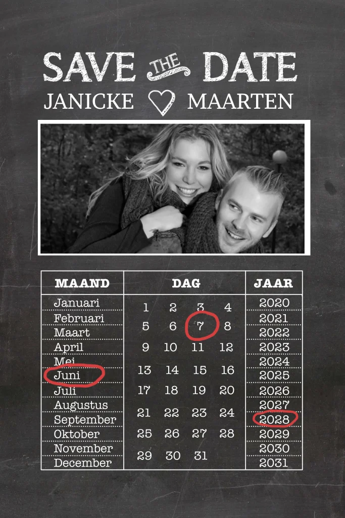 Save The Date kaart met kalender op de voorkant en schoolbord patroon op de achtergrond. Ruimte voor eigen foto. (1950)