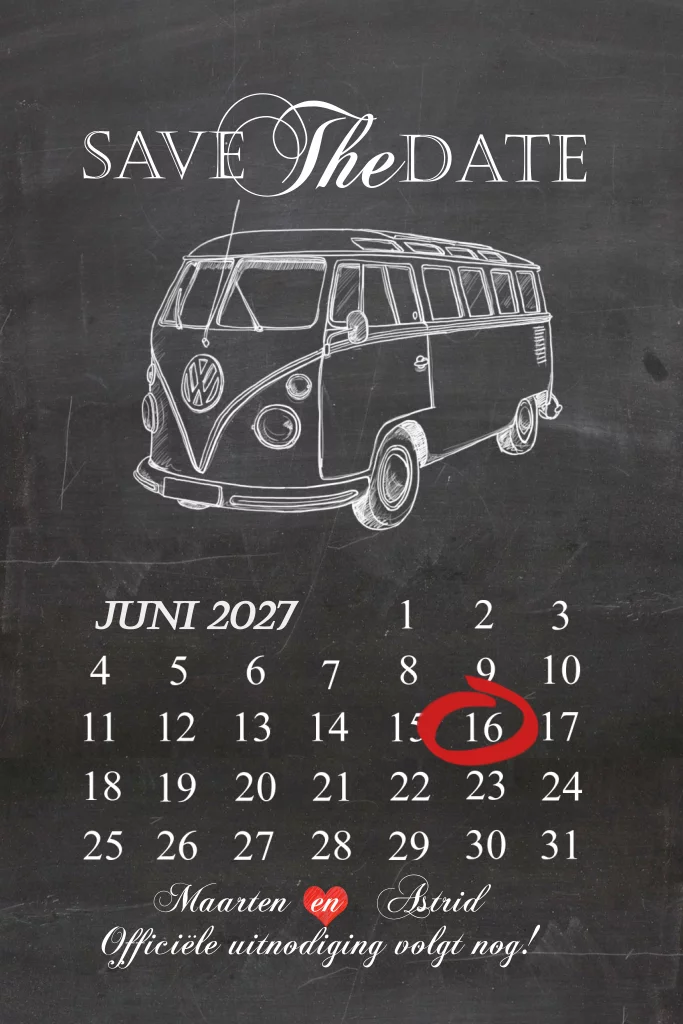Save The Date kaart met kalender op de voorkant en krijtbord patroon op de achtergrond. (2484)
