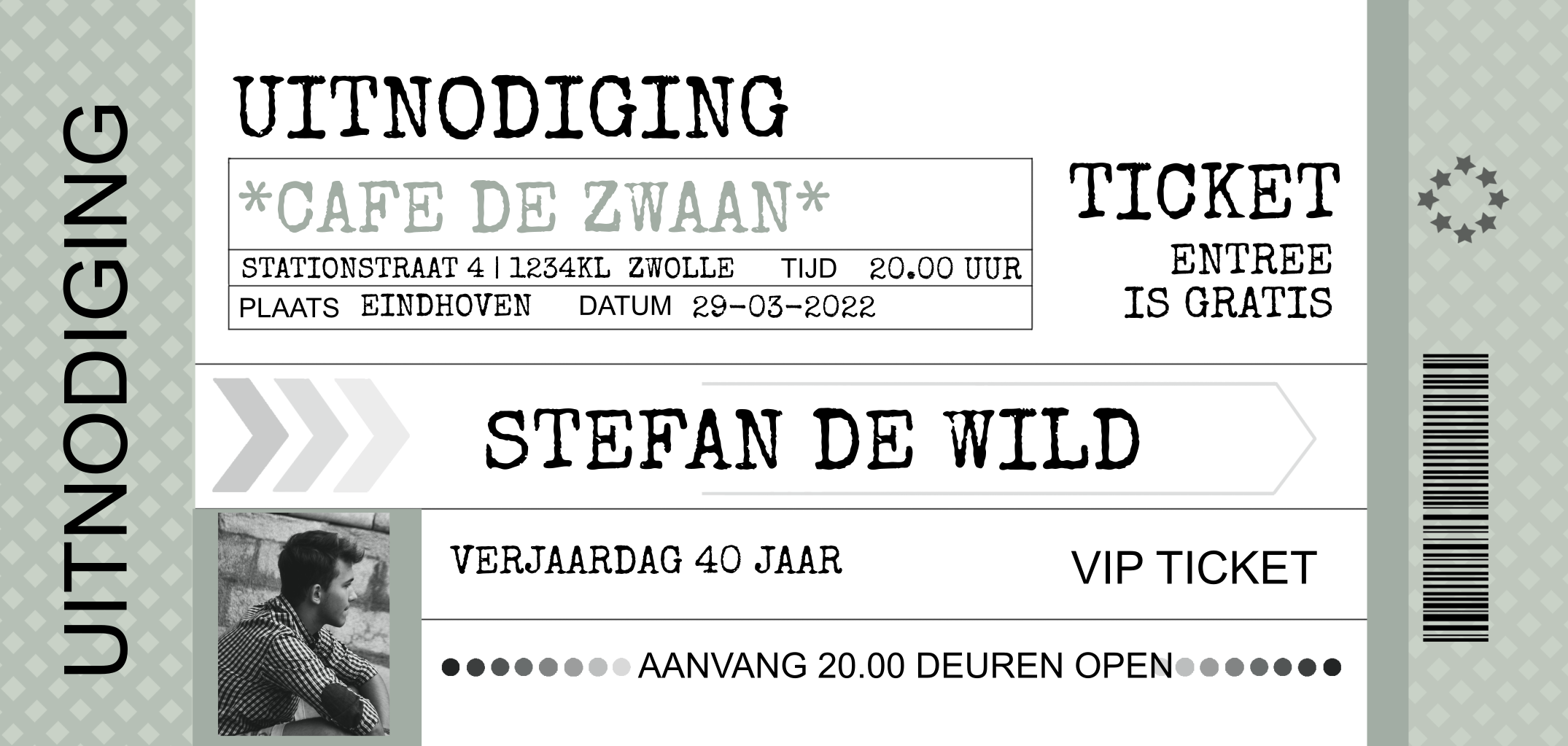 Hippe verjaardagsuitnodiging in ticket stijl met ruimte voor een foto groen. (22350)