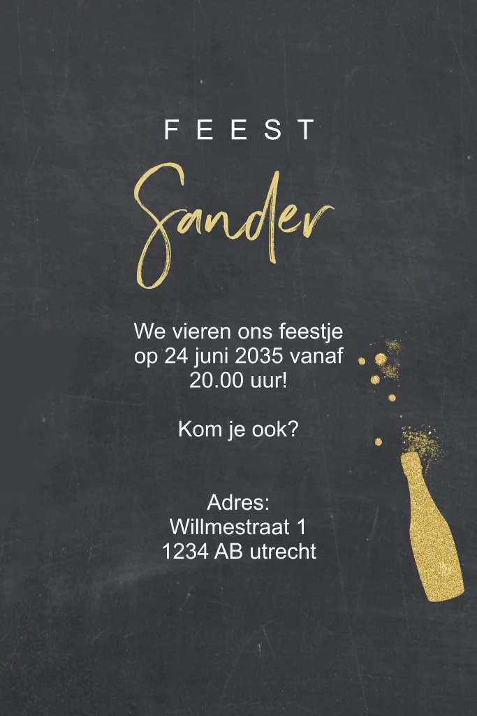 Uitnodiging 40e verjaardagsfeest met glitterlook fles en glas