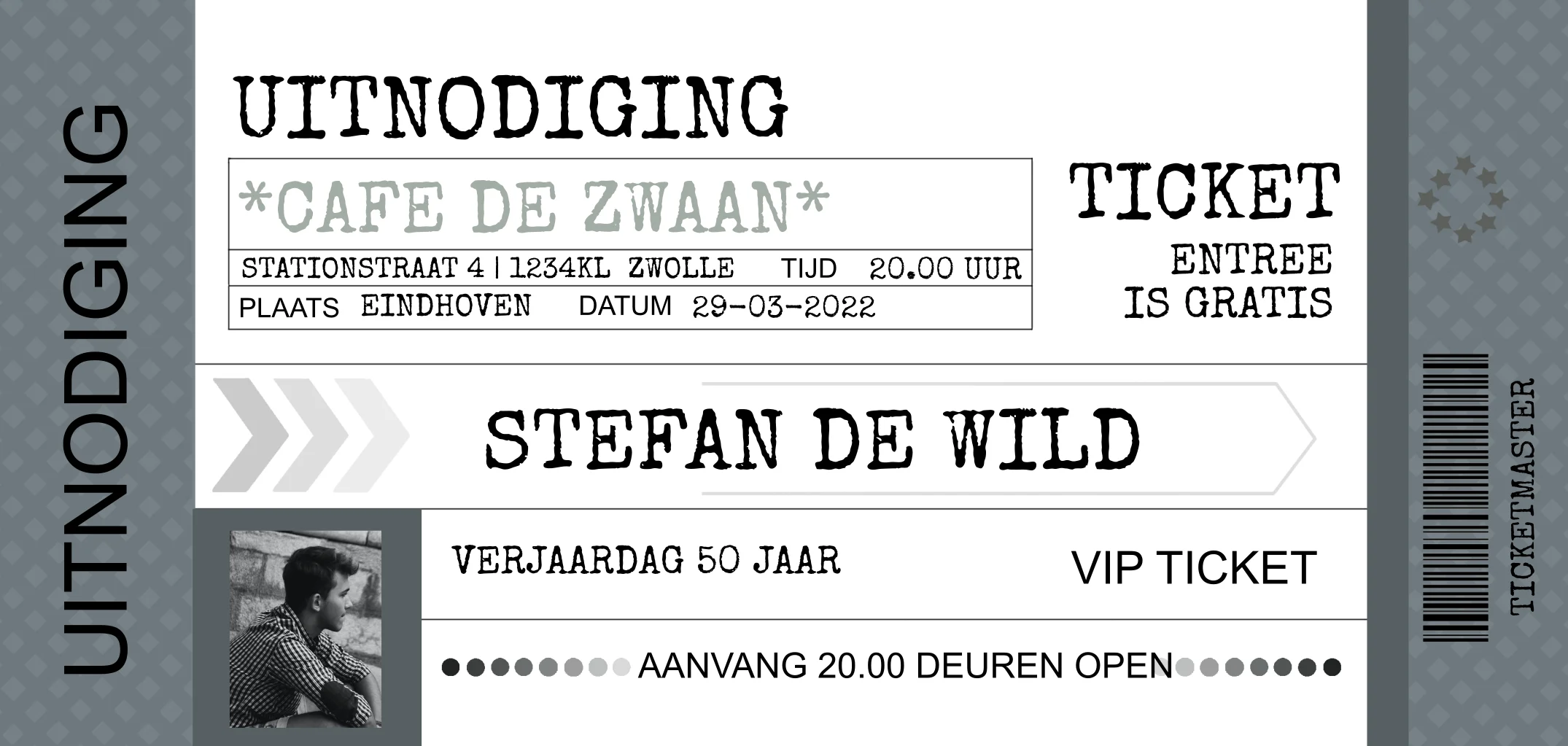 Hippe verjaardagsuitnodiging in ticket stijl met ruimte voor een foto grijsblauw. (22355)