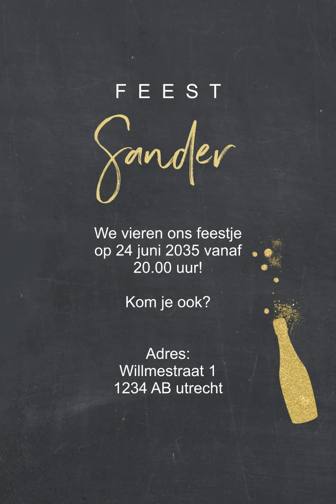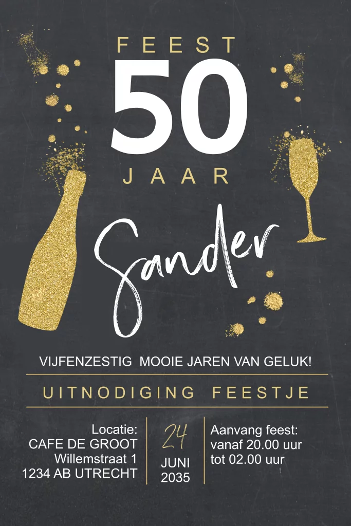 Stoere uitnodiging 50 jaar verjaardag met glitterlook fles en glas