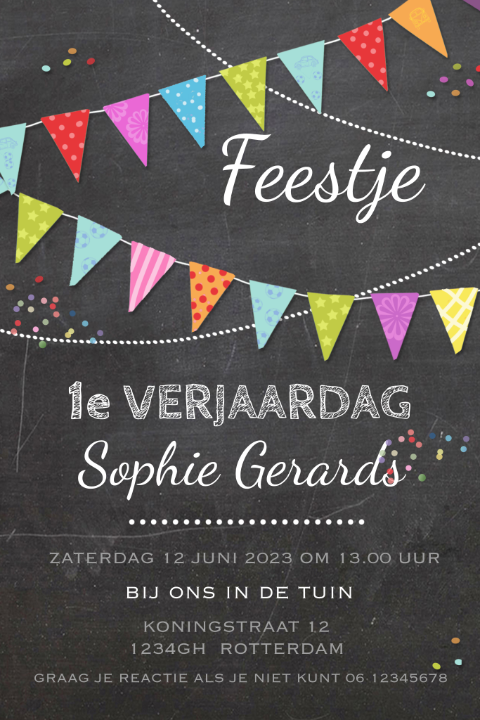 Hippe uitnodiging eerste verjaardage met confetti, krijtbord en vlaggetjes, achtergrond is aanpasbaar. (3307)