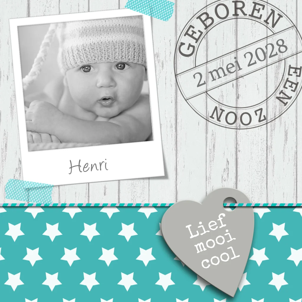 Mintgroen foto geboortekaartje jongen met sterren en stempel. (1459)