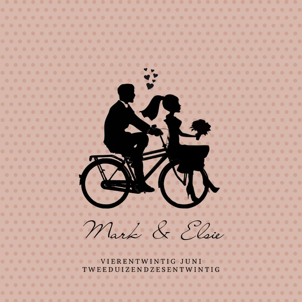 Trouwkaart op de fiets met bruidspaar op fiets in silhouet, deze kaart is aanpasbaar. (3085) Willen jullie de tekening aangepast hebben zodat het meer op jullie lijkt? Vaak is dat mogelijk, neem daarvoor contact met ons op.