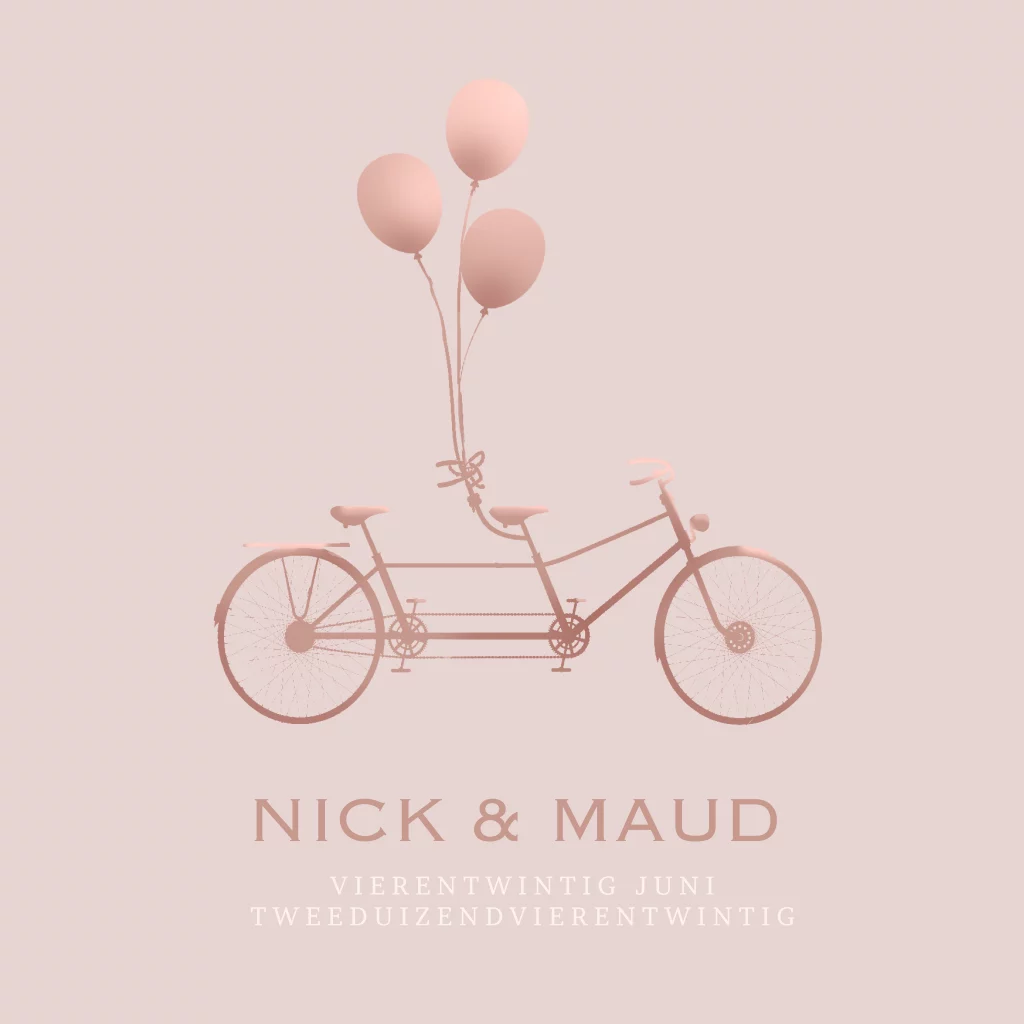 Huwelijkskaart met bruidspaar op fiets tandem in silhouet roze