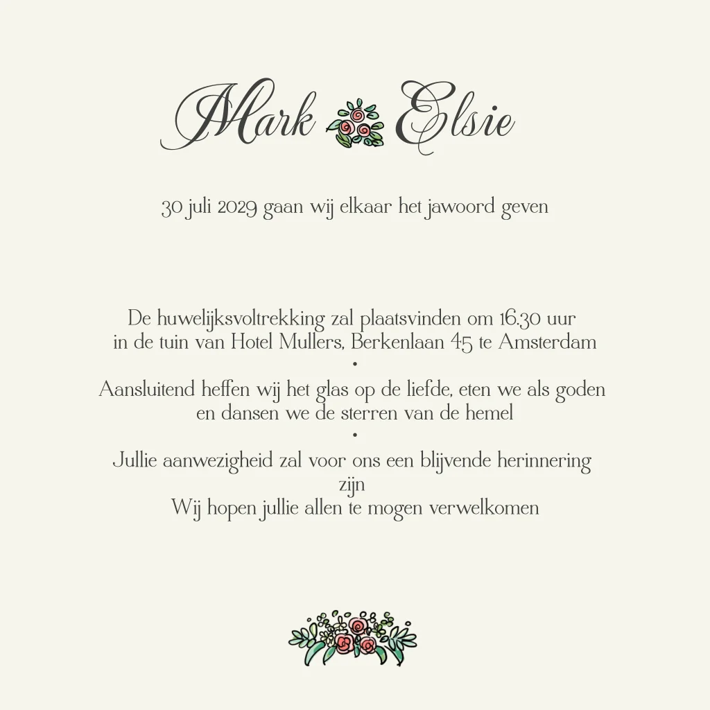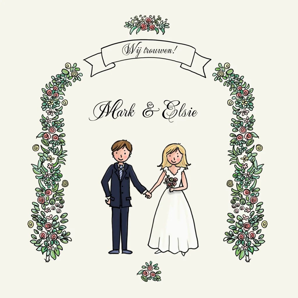 Trouwkaart met een leuk getekend bruidspaar met bloemenkrans in zachte tinten. Willen jullie de tekening aangepast hebben zodat het meer op jullie lijkt? Vaak is dat mogelijk, neem daarvoor contact met ons op. (2785)