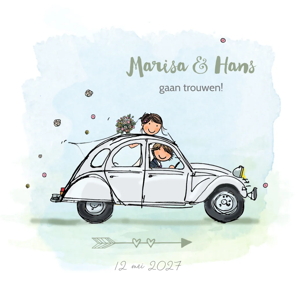 Trouwkaart daggasten met het bruidspaar in een oldtimer prachtige witte Citroen 2CV eend auto. Dit is mooi met de hand getekend. (4846) Willen jullie de tekening aangepast hebben zodat het meer op jullie lijkt? Vaak is dat mogelijk, neem daarvoor contact met ons op.