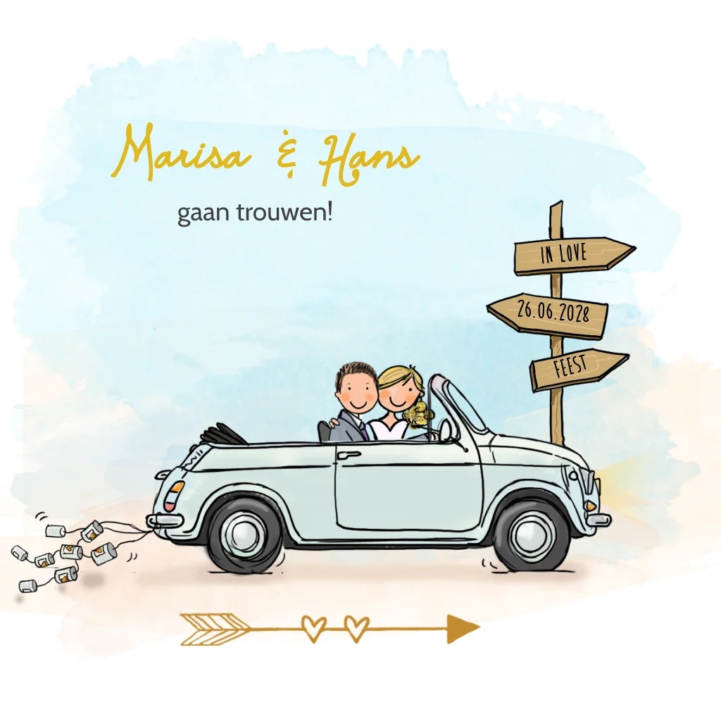 Trouwkaart met getekende mensen met prachtige trouwauto Fiat 500 cabriolet trouwauto met bruidspaar en bordjes. (4845) Willen jullie de tekening aangepast hebben zodat het meer op jullie lijkt? Vaak is dat mogelijk, neem daarvoor contact met ons op.