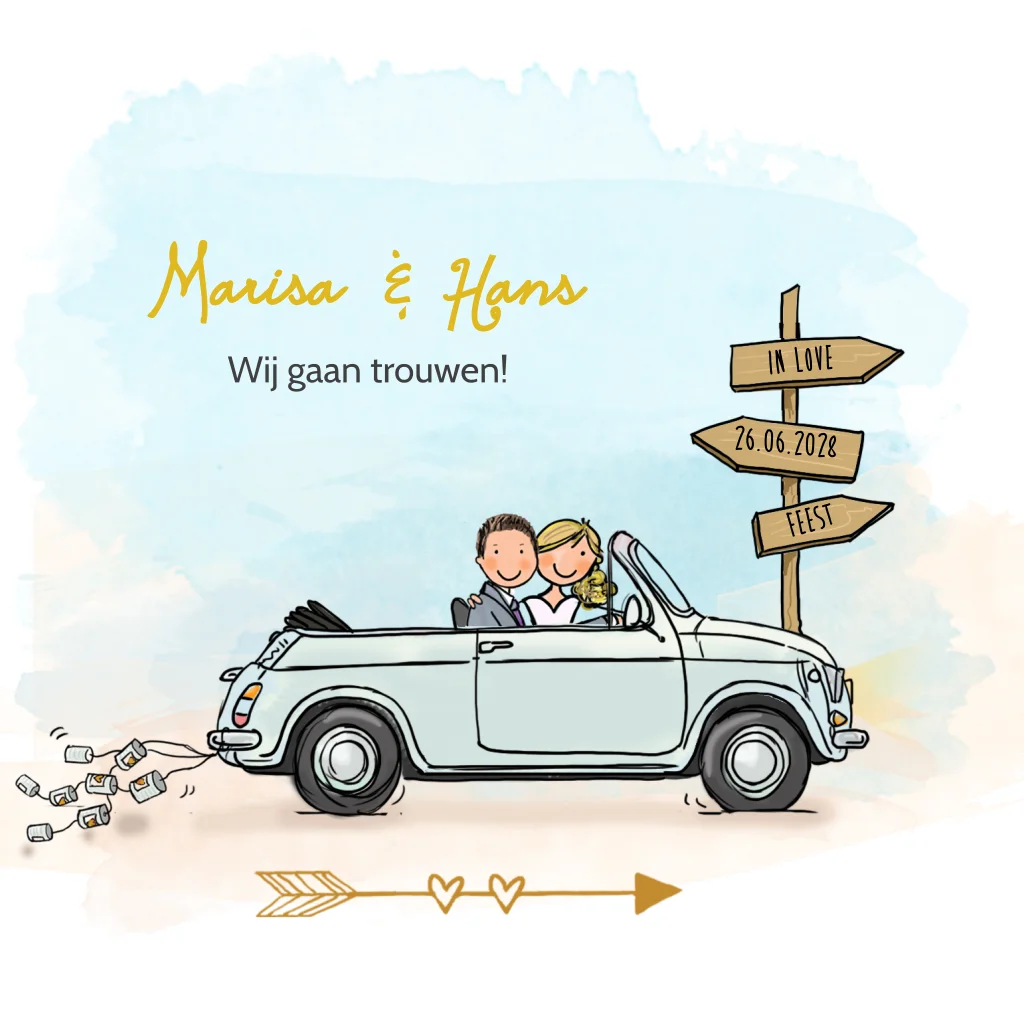 Trouwkaart getekende mensen met prachtige trouwauto Fiat 500 cabriolet trouwauto met bruidspaar en bordjes. (4845) Willen jullie de tekening aangepast hebben zodat het meer op jullie lijkt? Vaak is dat mogelijk, neem daarvoor contact met ons op.