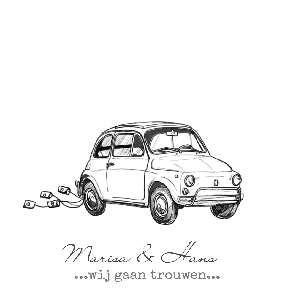 Trouwkaart met getekende Fiat 500 zwart wit