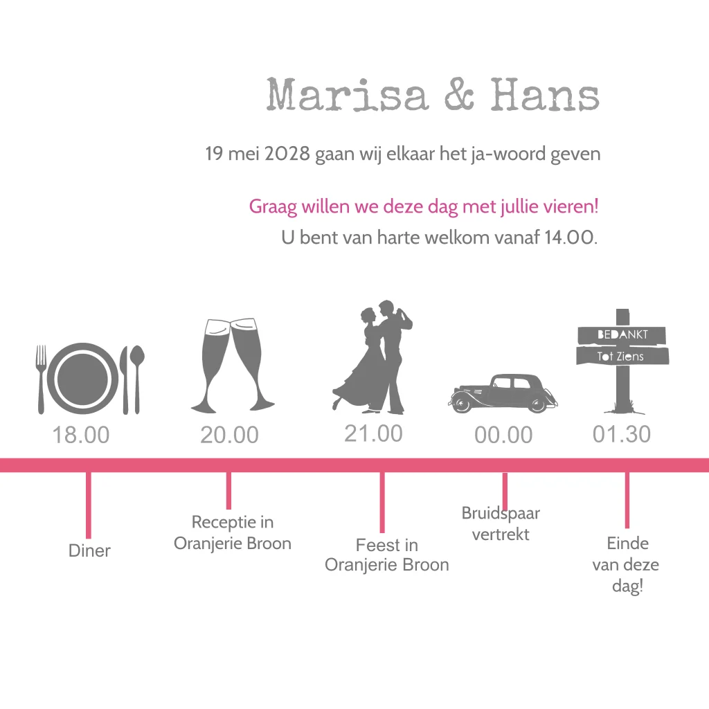 Trouwkaart met mooi retro getekende Fiat 500. Trouwsymbolen aan de binnenzijde voor de planning van de trouwdag. (3272)