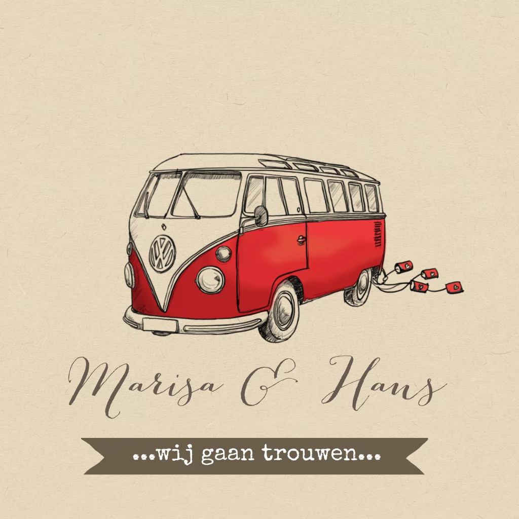 Uitnodiging Huwelijk trouwkaarten trouwkaart met prachtige Vw busje. Trouwiconen aan de binnenzijde. (4289)