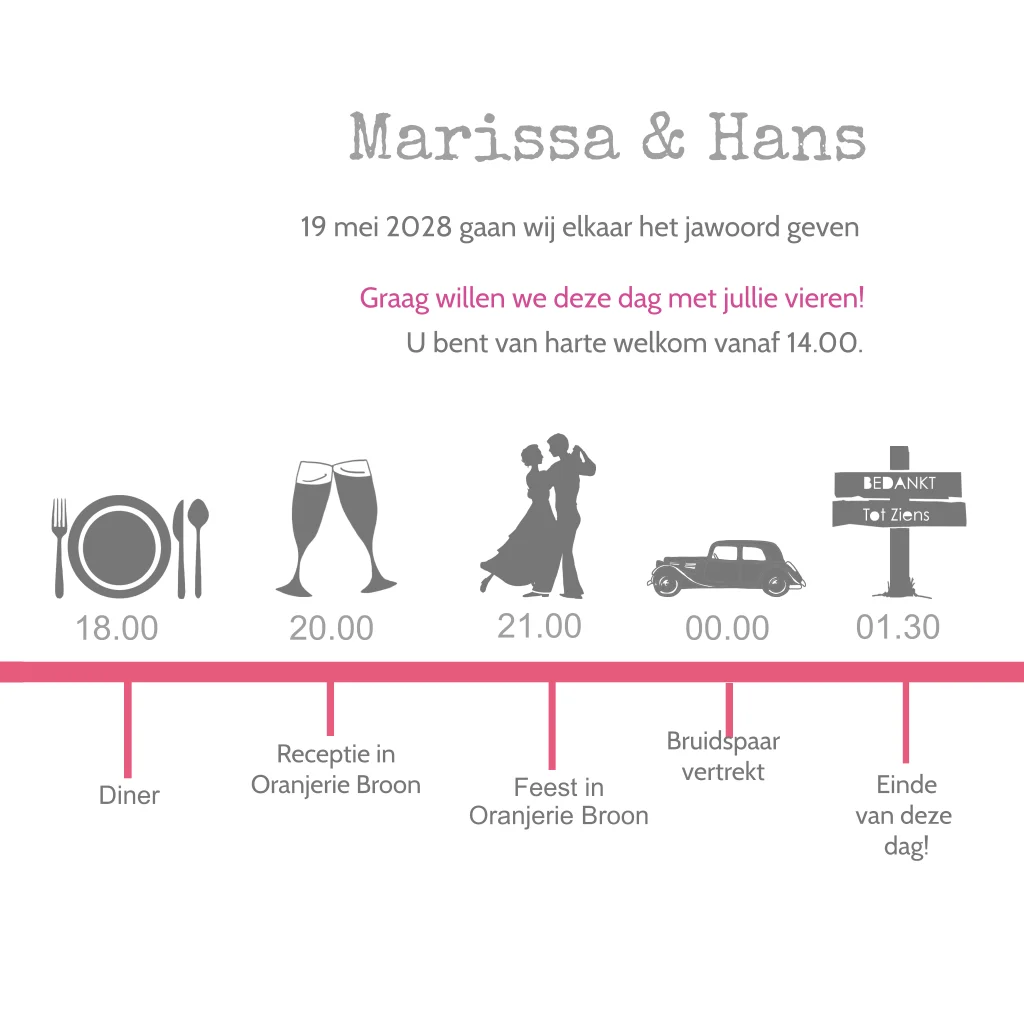 Trouwkaart uitnodiging met mooi getekende autobus in retro / vintage look. Trouwiconen aan de binnenzijde. (3273)