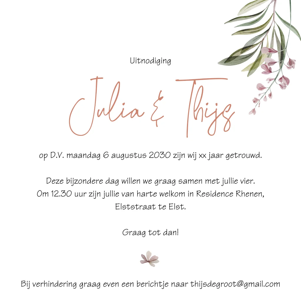 Jubileum uitnodiging 25 jaar getrouwd jubileumfeestje of etentje met getekende bloemen krans in prachtige kleuren en met takjes met bladeren. (22425)