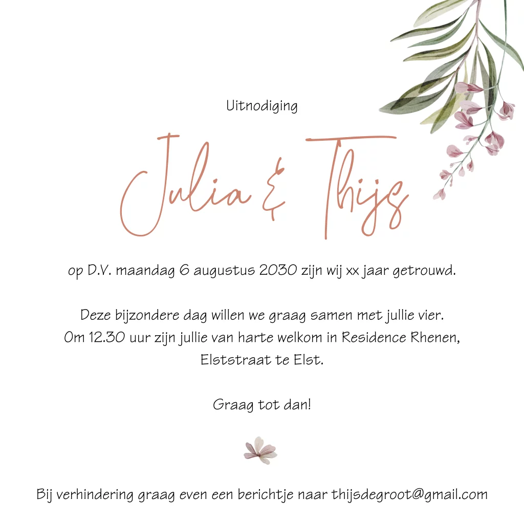 Jubileum uitnodigingskaart 25 jaar getrouwd met krans en prachtige bloemen en takjes. (22425)