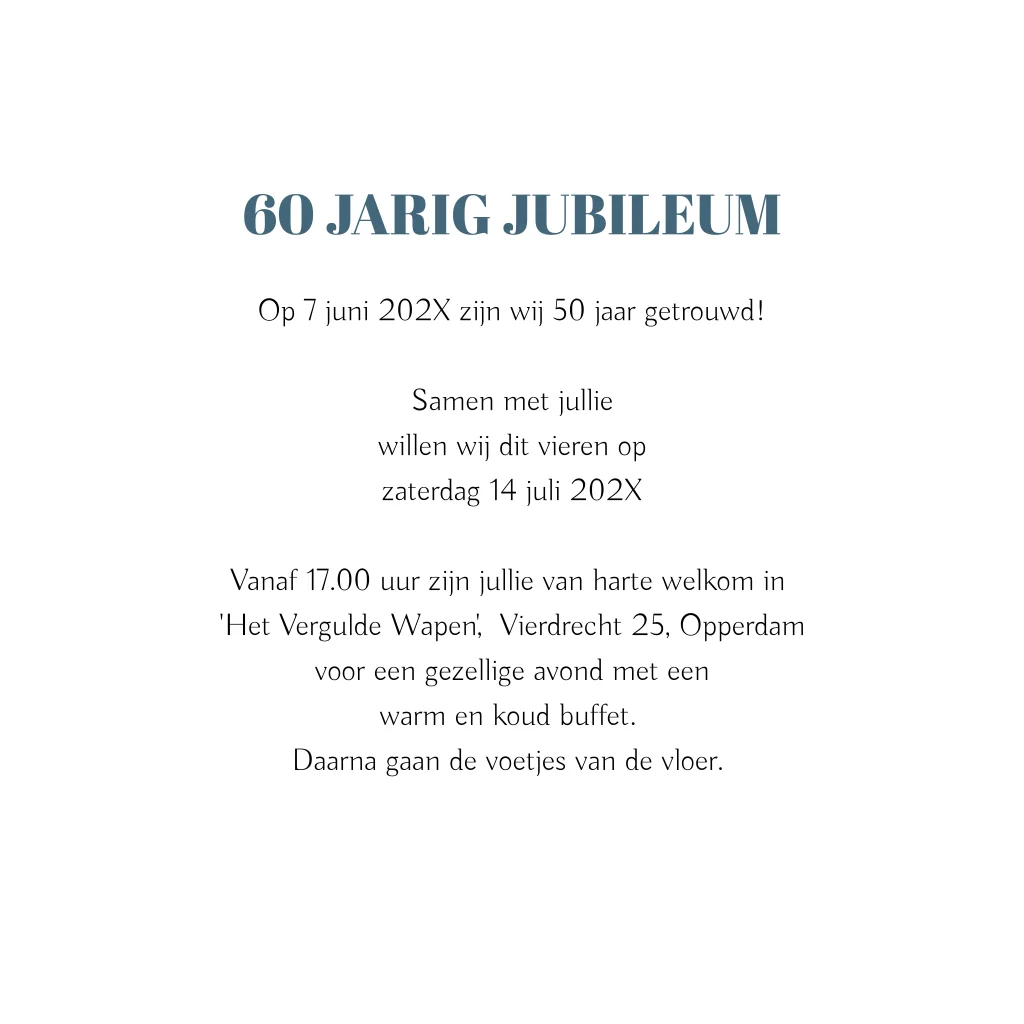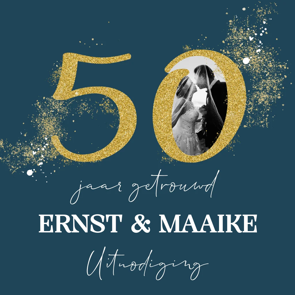 Uitnodiging voor een jubileum 50 jaar getrouwd feest met een blauwe achtergrond, ruimte voor het plaatsen van een eigen foto en gouden spetters. (30331)