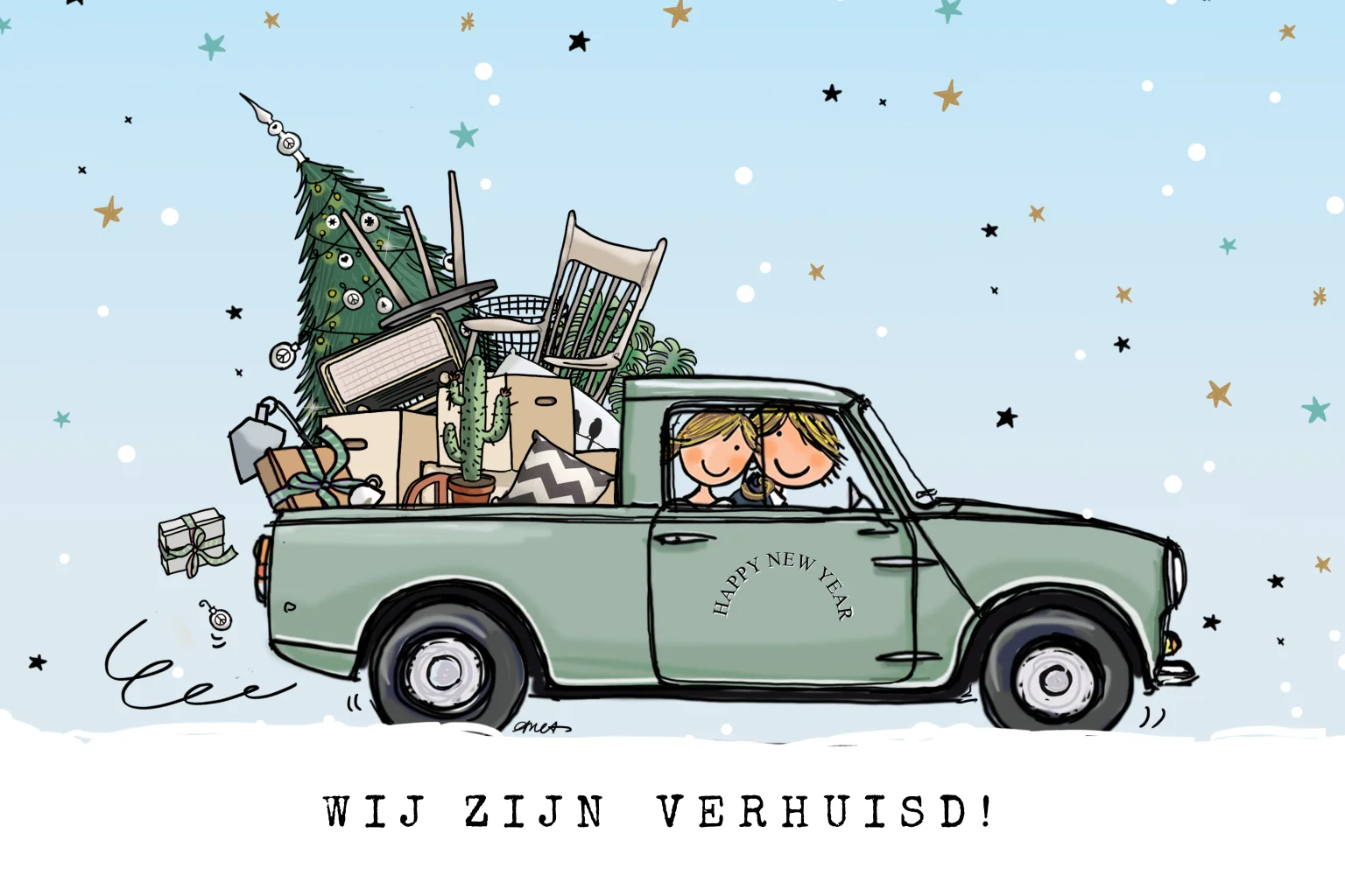 Vrolijke getekende kerst verhuiskaart met mini pickup. Met witte achtergrond en sterren. (4103)