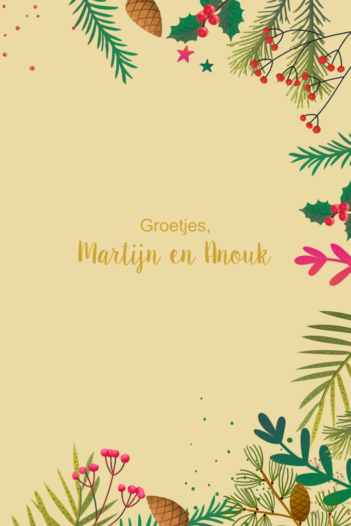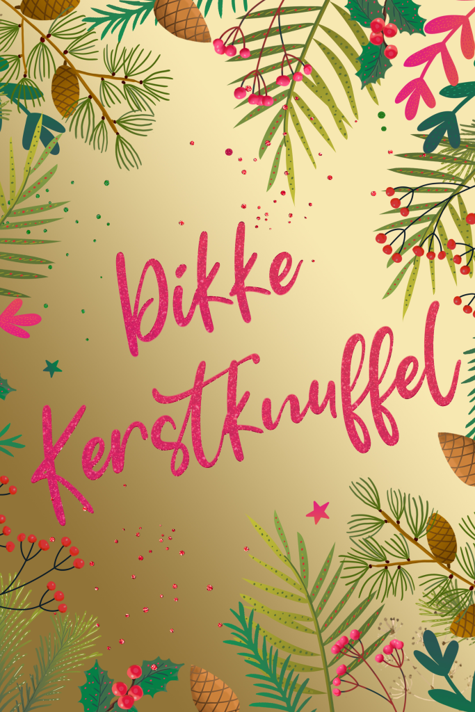 Kerstkaart dikke kerstknuffel dennenappels en takjes staand