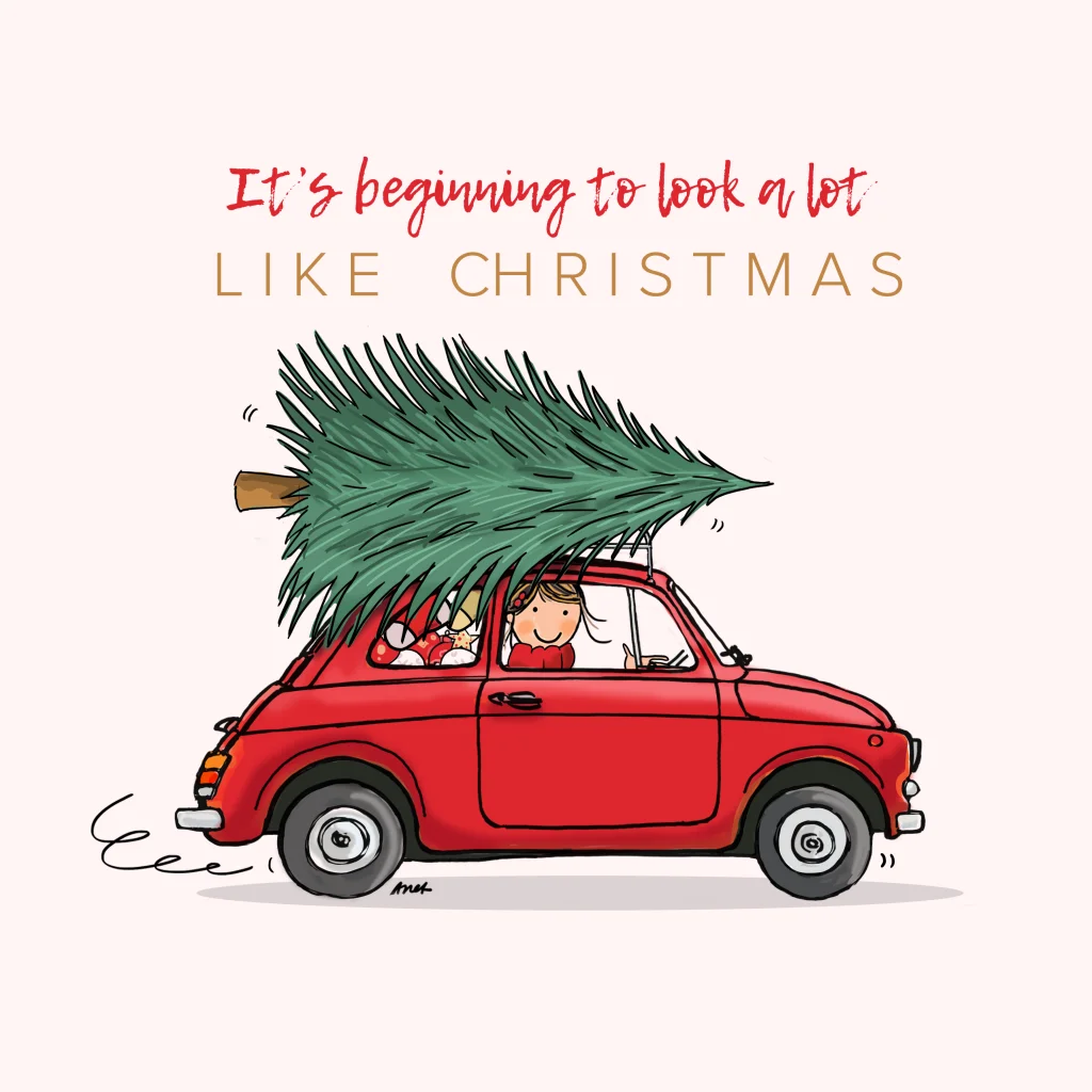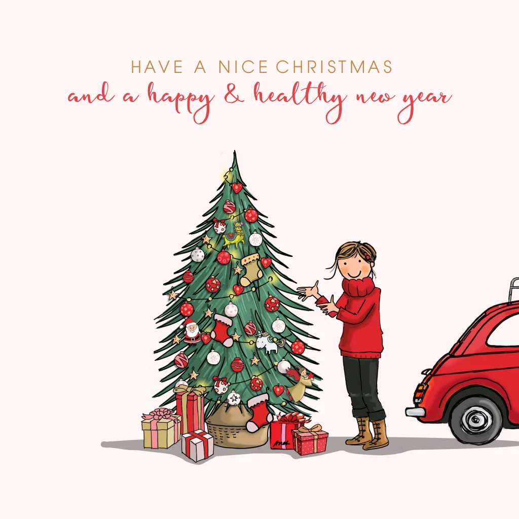 Kerstkaart Fiat 500 met kerstboom op het dak en een vrouw meisje in de auto. (7601)