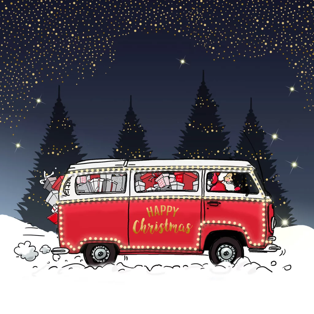 Mooi getekende kerstkaart met volkswagen en kerstman met goudkleurige sterren lucht. (6074)