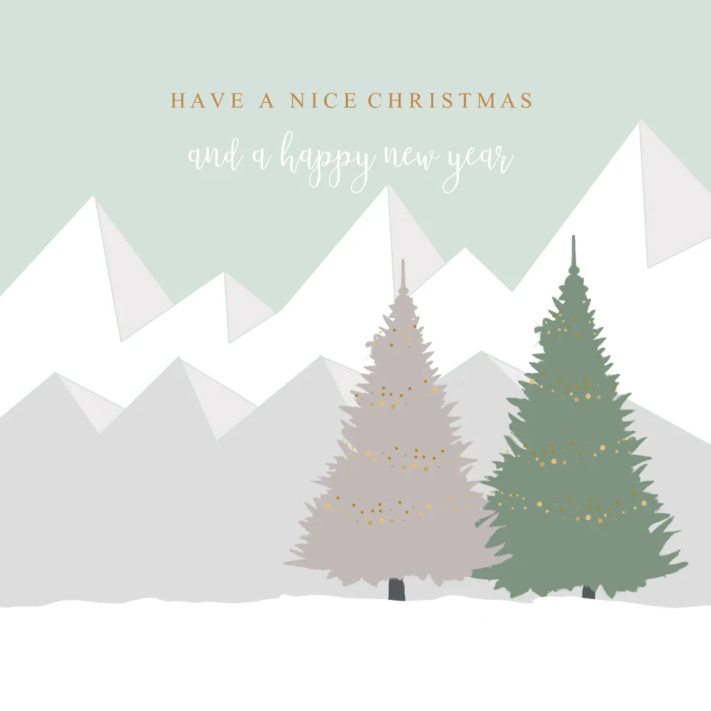 Moderne getekende kerstkaart met witte citroen 2CV in moderne stijl met mooi landschap. (7606)