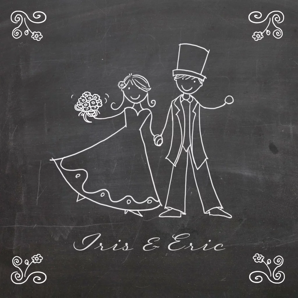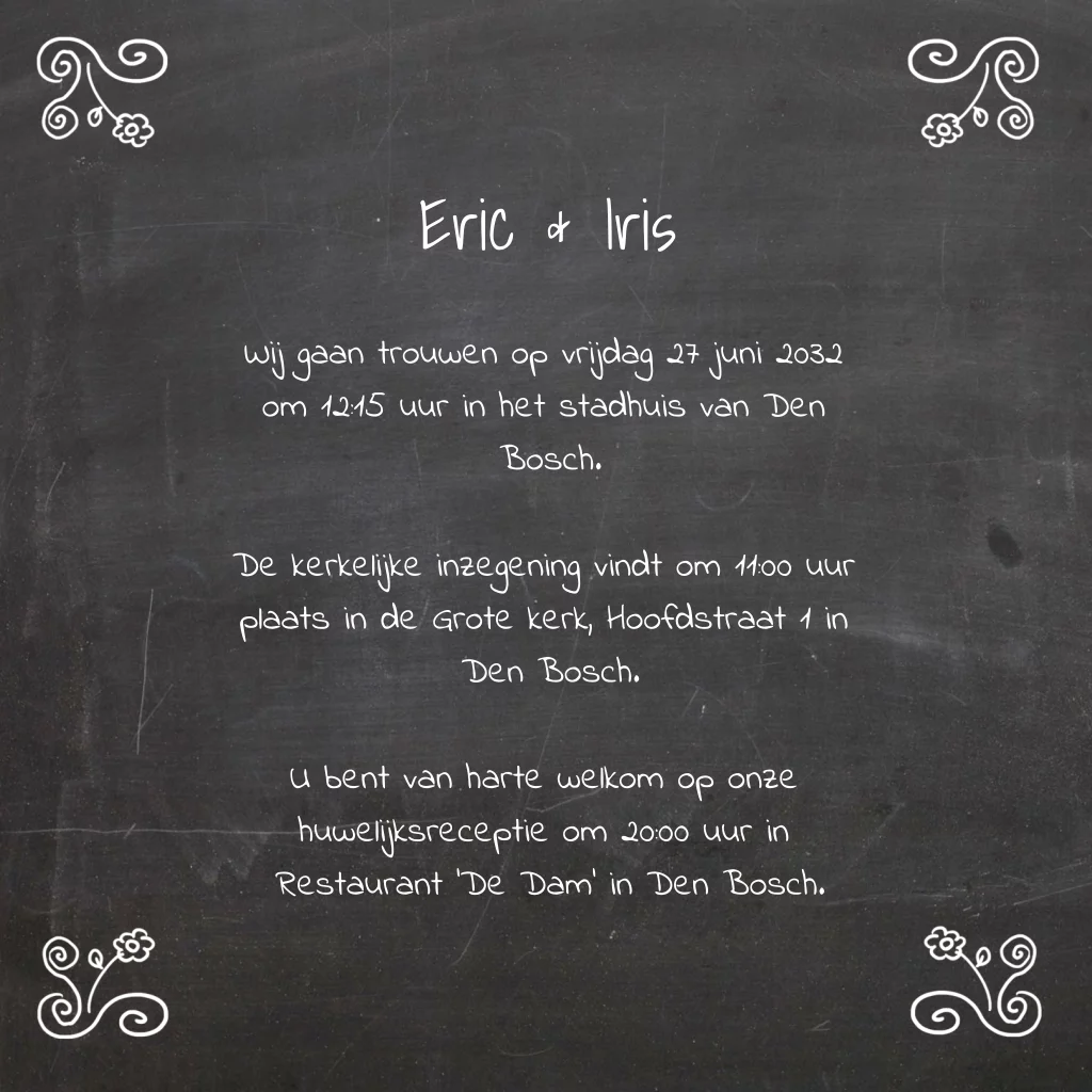 Trouwkaart met vrolijk getekend bruidspaar op een zwarte krijtbord look achtergrond. Bloemetjes op de achtergrond. (785)