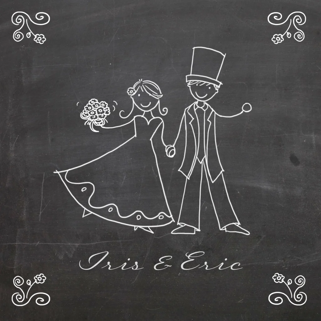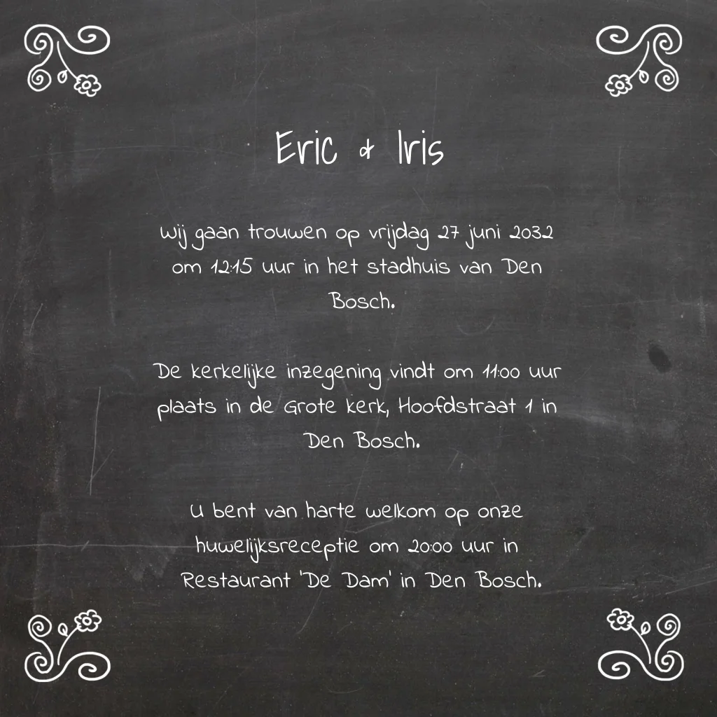 Trouwkaart met vrolijk getekend bruidspaar op een zwarte krijtbord look achtergrond. Bloemetjes op de achtergrond. (785) Willen jullie de tekening aangepast hebben zodat het meer op jullie lijkt? Vaak is dat mogelijk, neem daarvoor contact met ons op.