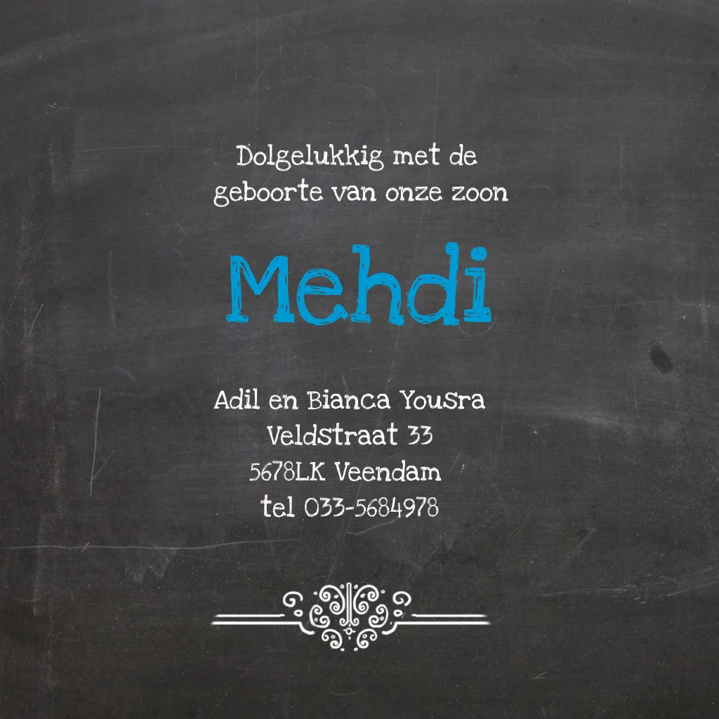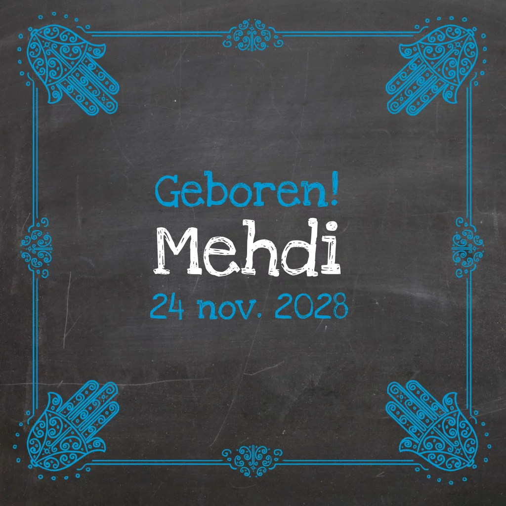 Bijzonder liefdevol geboortekaartje van handje van Fatima in krijtbord en illustraties. (1810)