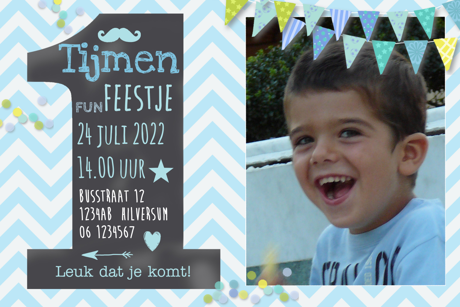 Krijtbord een uitnodiging kinderfeestje jongen met foto zigzag
