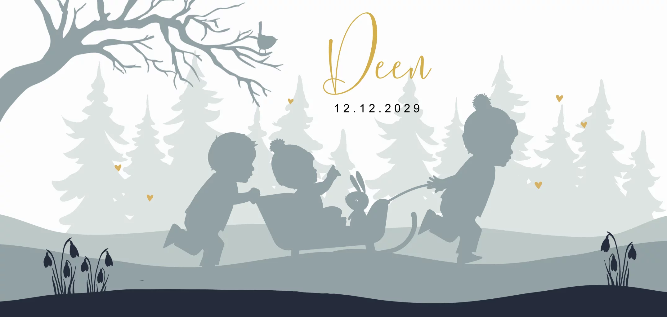 Winter geboortekaart jongen 3e kindje in een slee met 2 broers jongens. (22824)