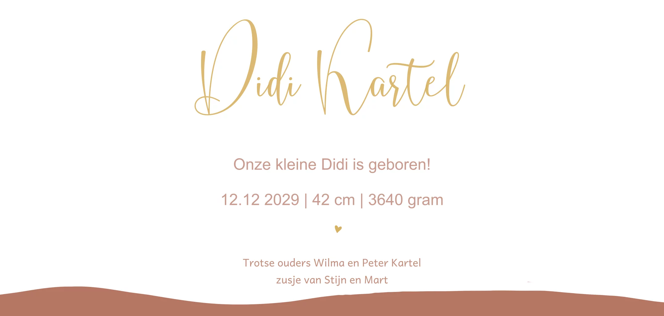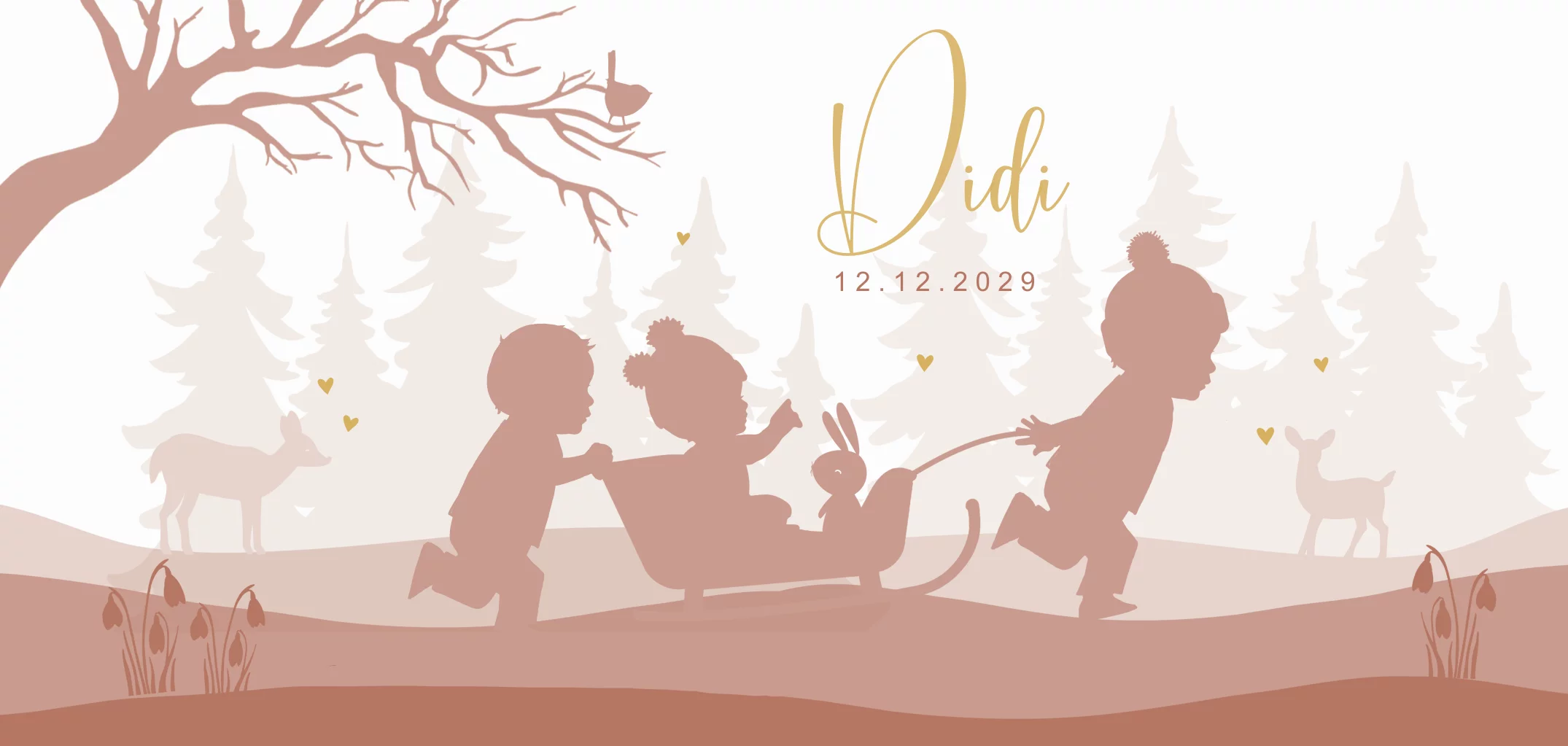 Langwerpig liggende vorm geboortekaartje voor een baby meisje wat een 3e kindje is in winters tafereel met sneeuw en slee en 2 grote broers jongens. (22823)