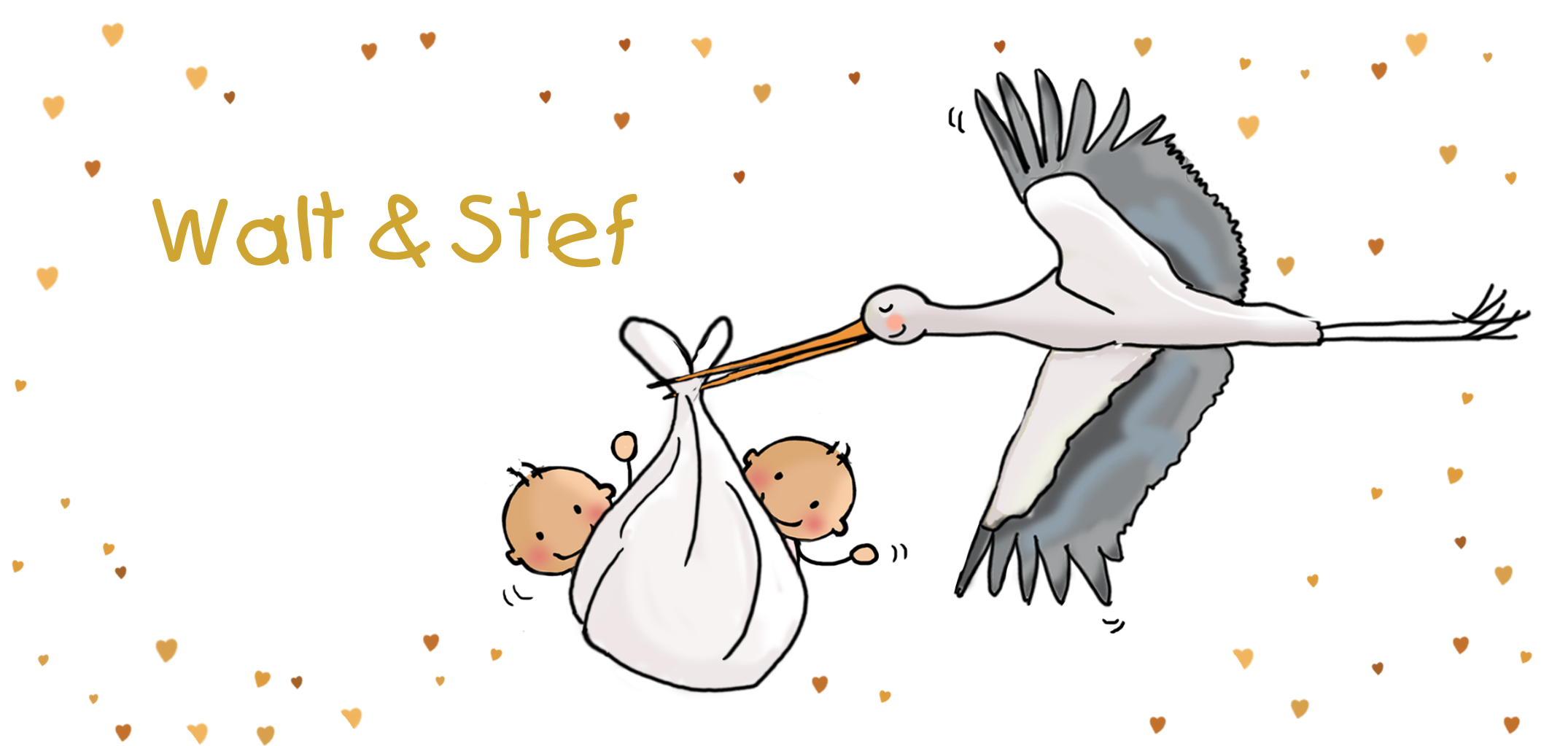 Langwerpige liggende geboortekaart met tweeling en ooievaar wit