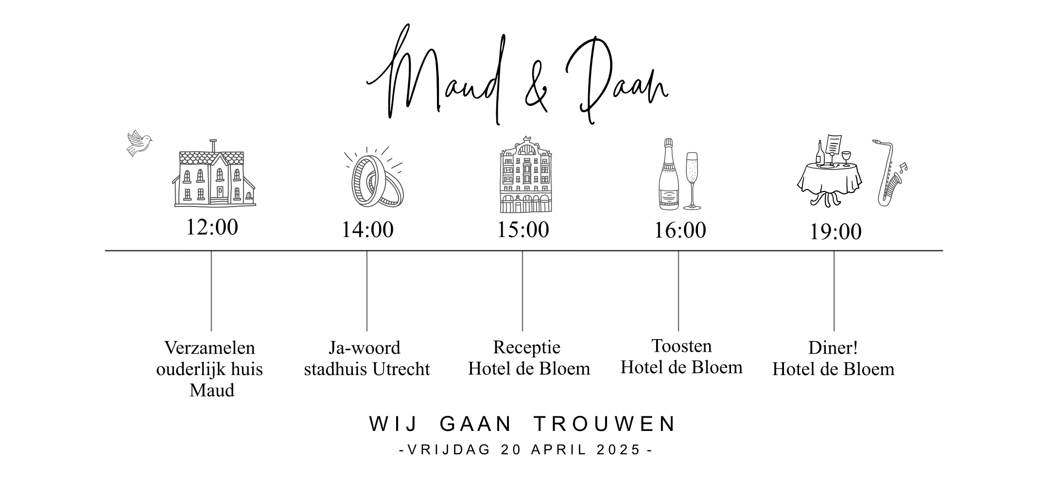 Langwerpige liggende tijdlijn trouwkaart enkel wit. (20815)