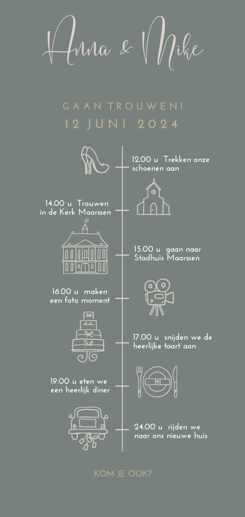 Langwerpige staande trouwkaart tijdlijn hip groen. (20872) Deze kaart is nu voorzien van ronde hoeken (meerprijs € 0,30). Wil je rechte hoeken? Zet het om bij achtergrond in de kaartenmaker.
