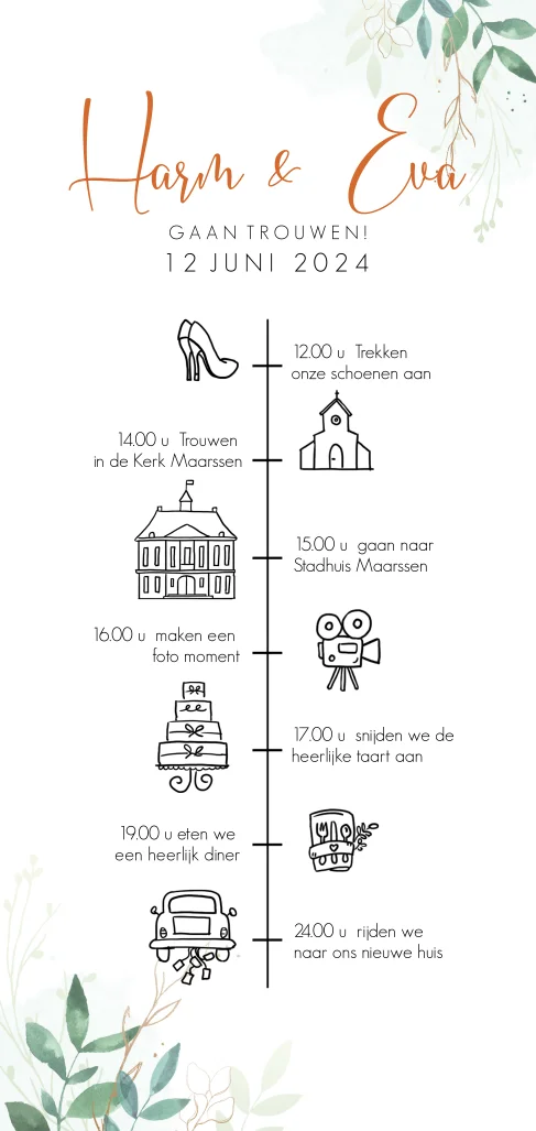 Langwerpige staande trouwkaart tijdlijn staand. (20863) Deze kaart is nu voorzien van ronde hoeken (meerprijs € 0,30). Wil je rechte hoeken? Zet het om bij achtergrond in de kaartenmaker.