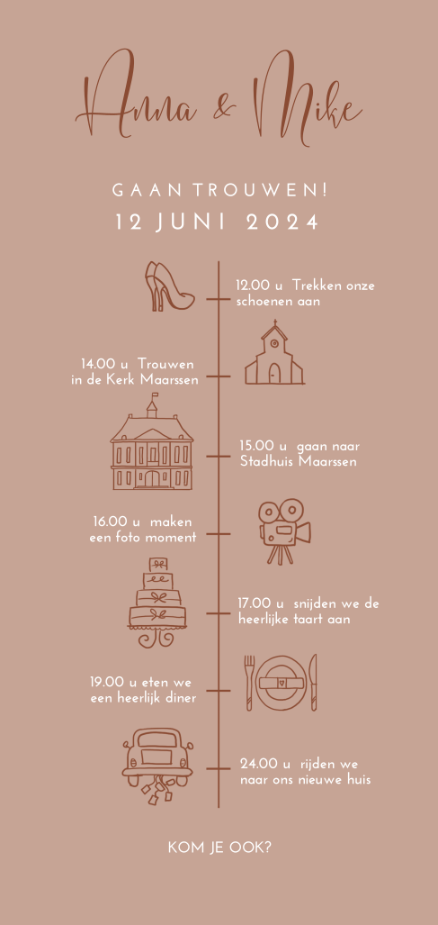 Langwerpige staande trouwkaart tijdlijn warme kleur terra cotta. (20869). Deze kaart is nu voorzien van ronde hoeken (meerprijs € 0,30). Wil je rechte hoeken? Zet het om bij achtergrond in de kaartenmaker.