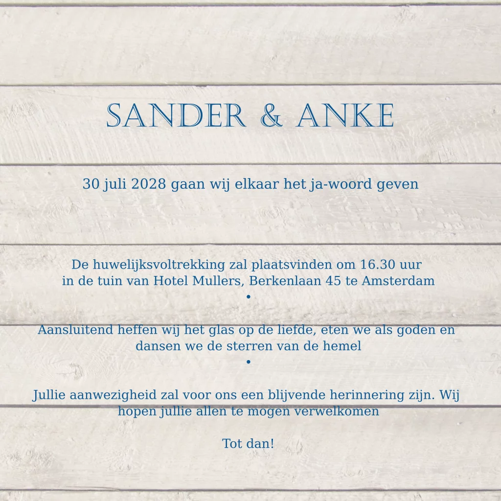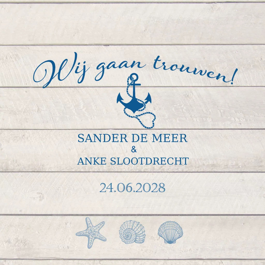 Leuke maritieme trouwkaart met blauwe anker van boot en houten planken. Zee strandthema. (2744) Kan gebruikt voor een kapitein en/of schipper