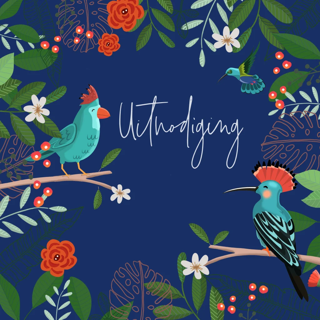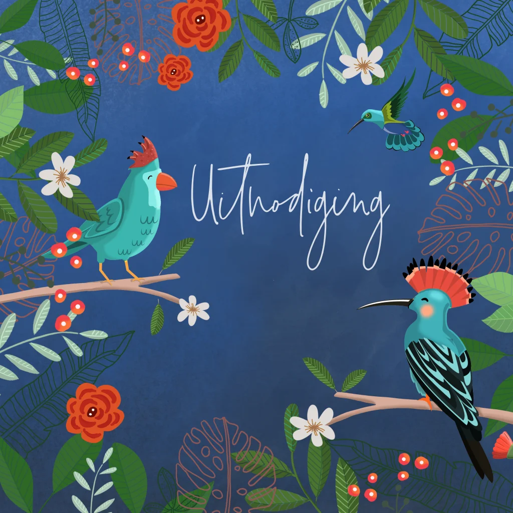 Uitnodiging 40 jaar getrouwd met getekende takken, bloemen en vrolijke vogels. (8616)