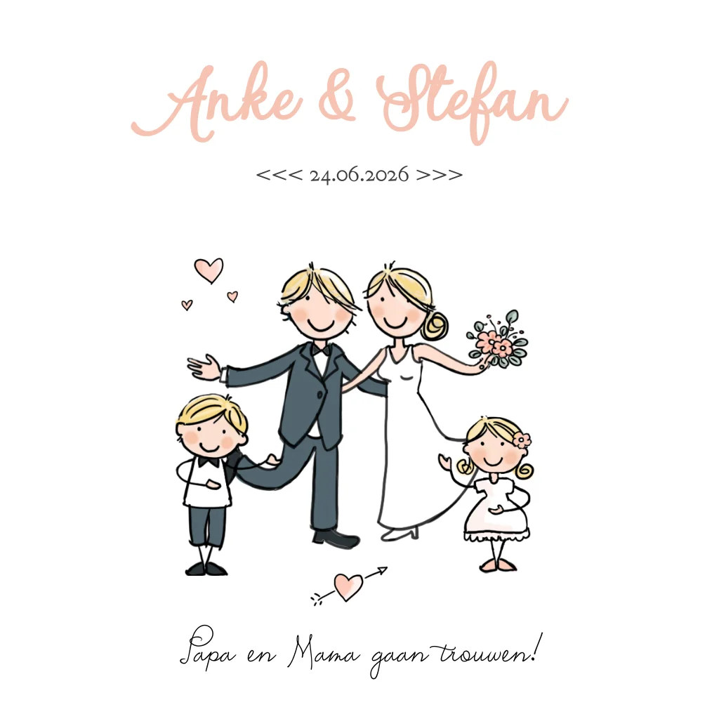 Leuk getekende trouwkaart papa en mama trouwen met bruidspaar en kinderen. Kindje is te verplaatsen of te verwijderen. Tevens kunnen wij een kindje toevoegen/spiegelen. Willen jullie de tekening aangepast hebben zodat het meer op jullie lijkt? Vaak is dat mogelijk, neem daarvoor contact met ons op. (6663)