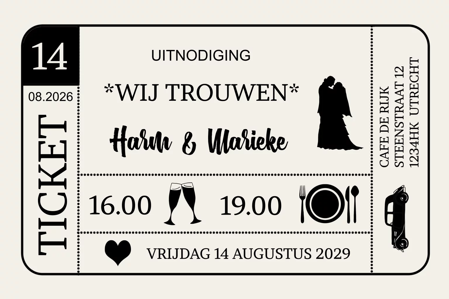 Stoere trouwkaart ticket met geheel aanpasbare tekst en achtergrond. (3199). Deze kaart is nu voorzien van ronde hoeken (meerprijs € 0,30). Wil je rechte hoeken? Zet het om bij achtergrond in de kaartenmaker.