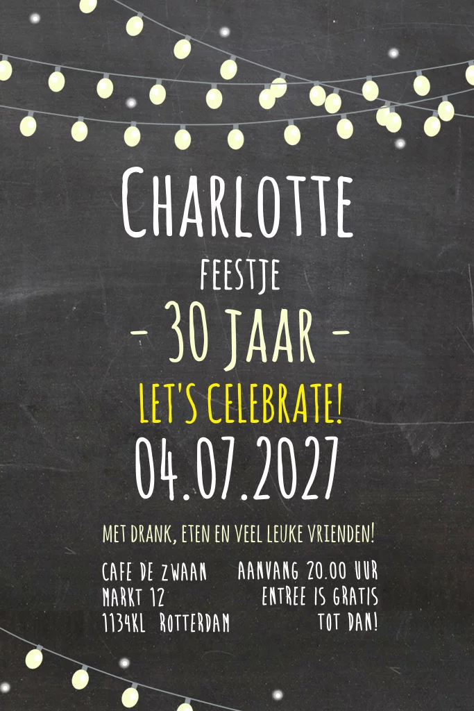 uitnodiging 30 jaar verjaardag verjaardagfeest krijtbord met slinger van lampjes. (3136)