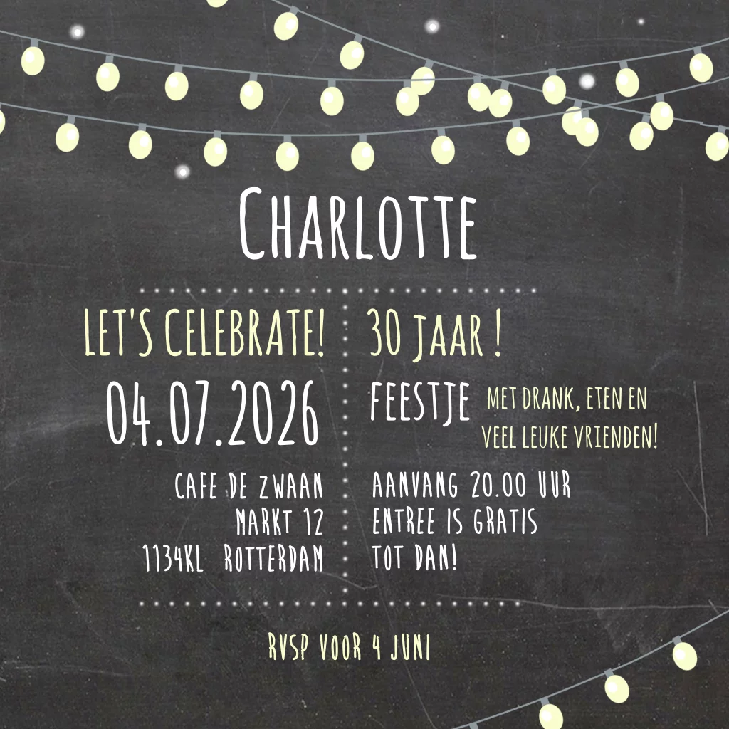 30 jaar uitnodiging verjaardagfeest krijtbord met slinger van lampjes vierkant. (3194)