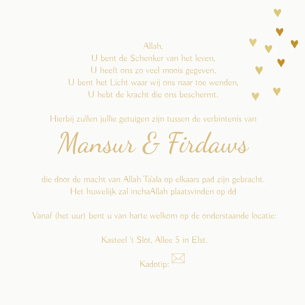 Originele arabische trouwkaart met goudkleurige hartjes. (2840)