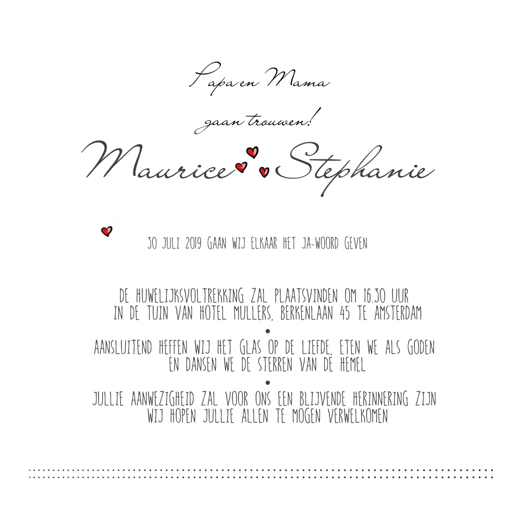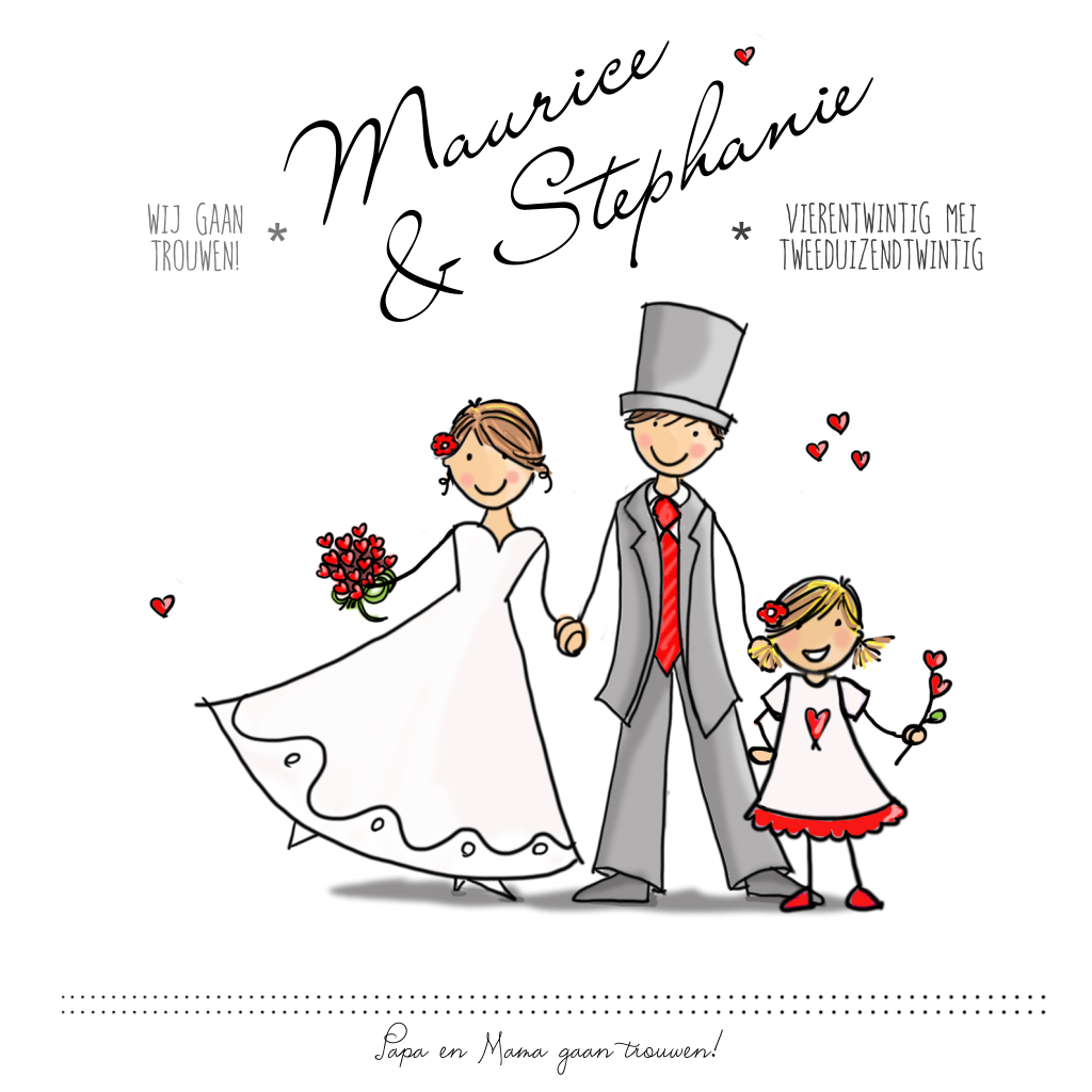 Papa en mama gaan trouwen huwelijkskaart met getekend bruidspaar en dochter met rode hartjes en aanpasbare teksten. Kindje is te verplaatsen of te verwijderen. (2813)