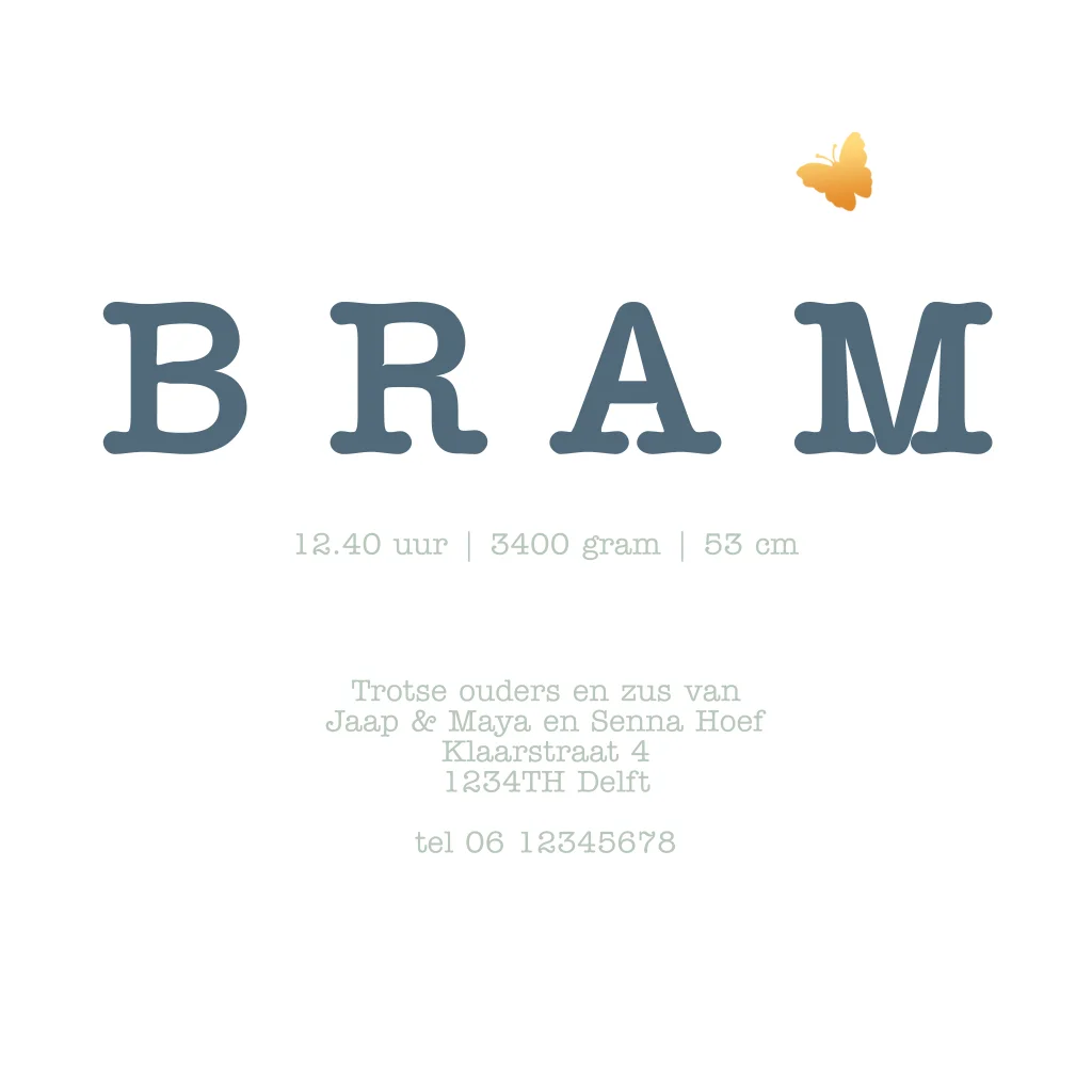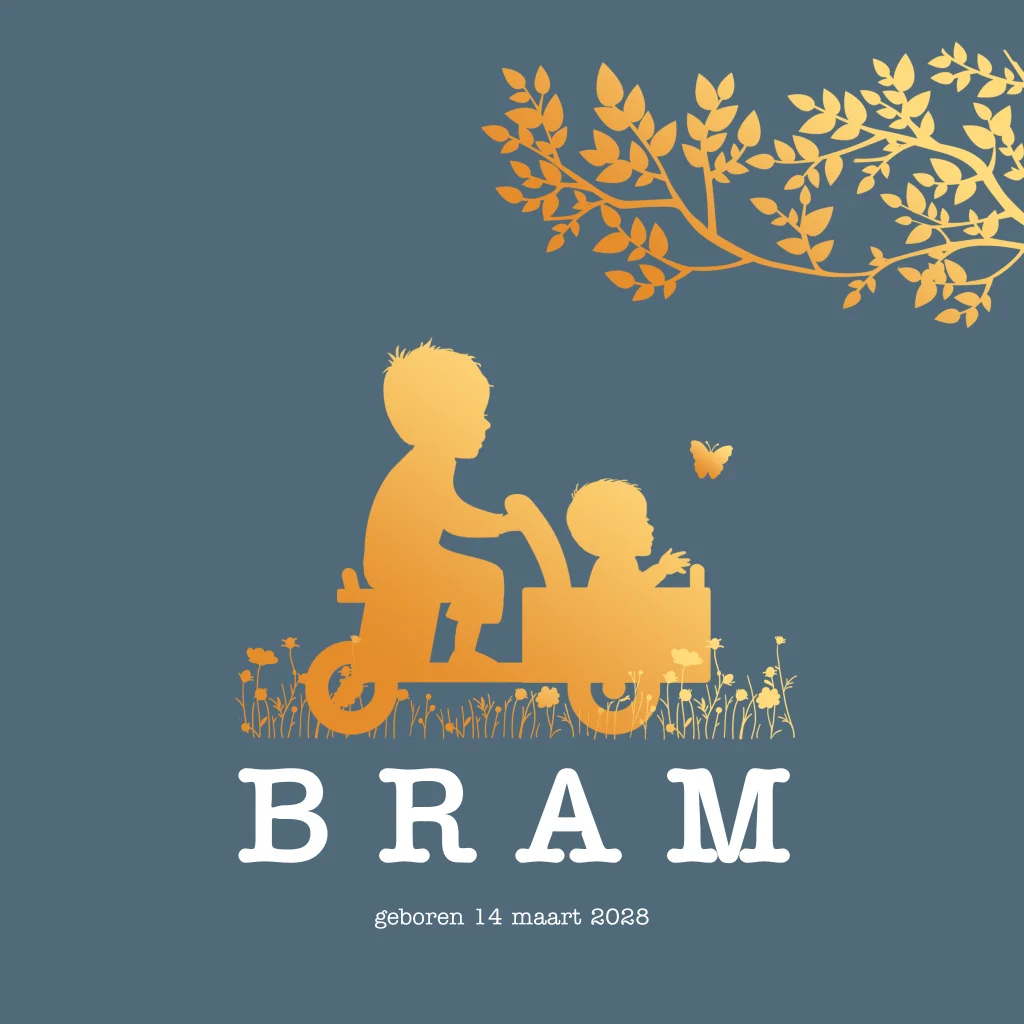 2e kindje geboortekaart jongen koperlook bakfiets koperlook met een tak van een boom. (8787)